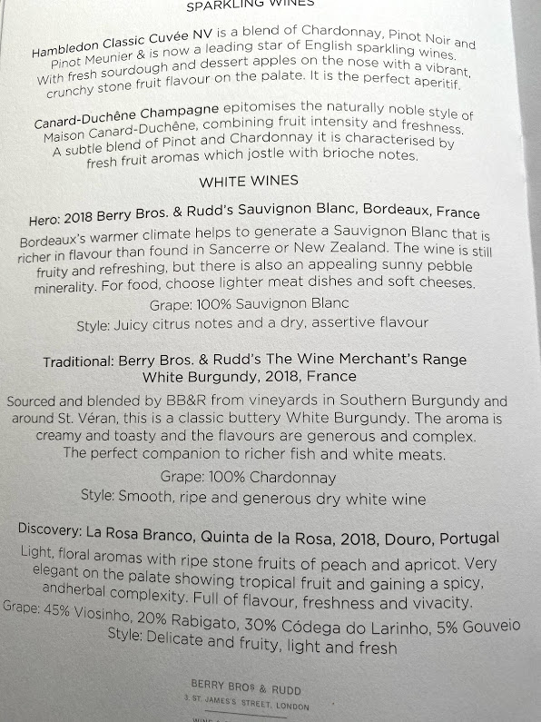The service started with drinks and popcorn. I opted to have the sparkling wine, Hambledon, which is extremely good and comes from very close to where I live! It seemed a strange choice of glass for champagne though.
