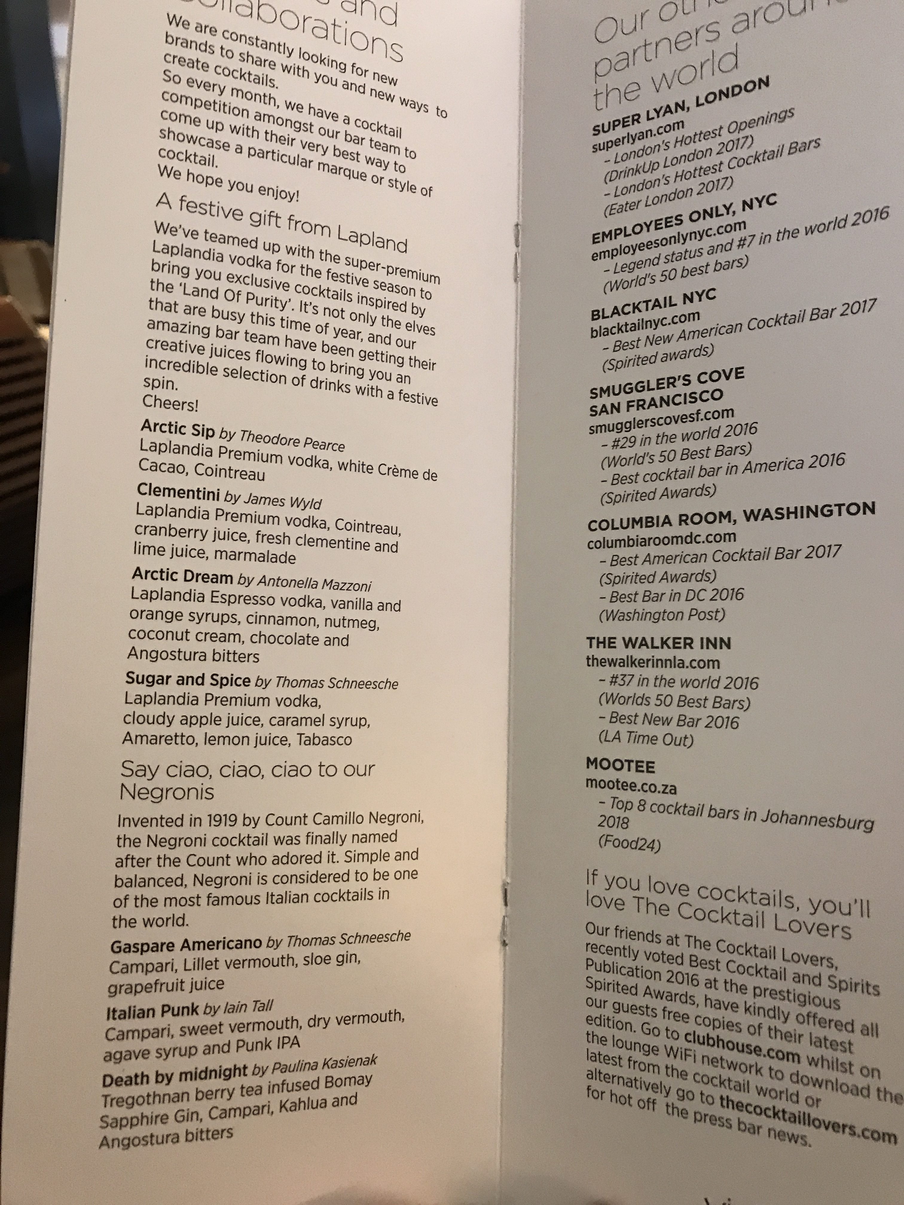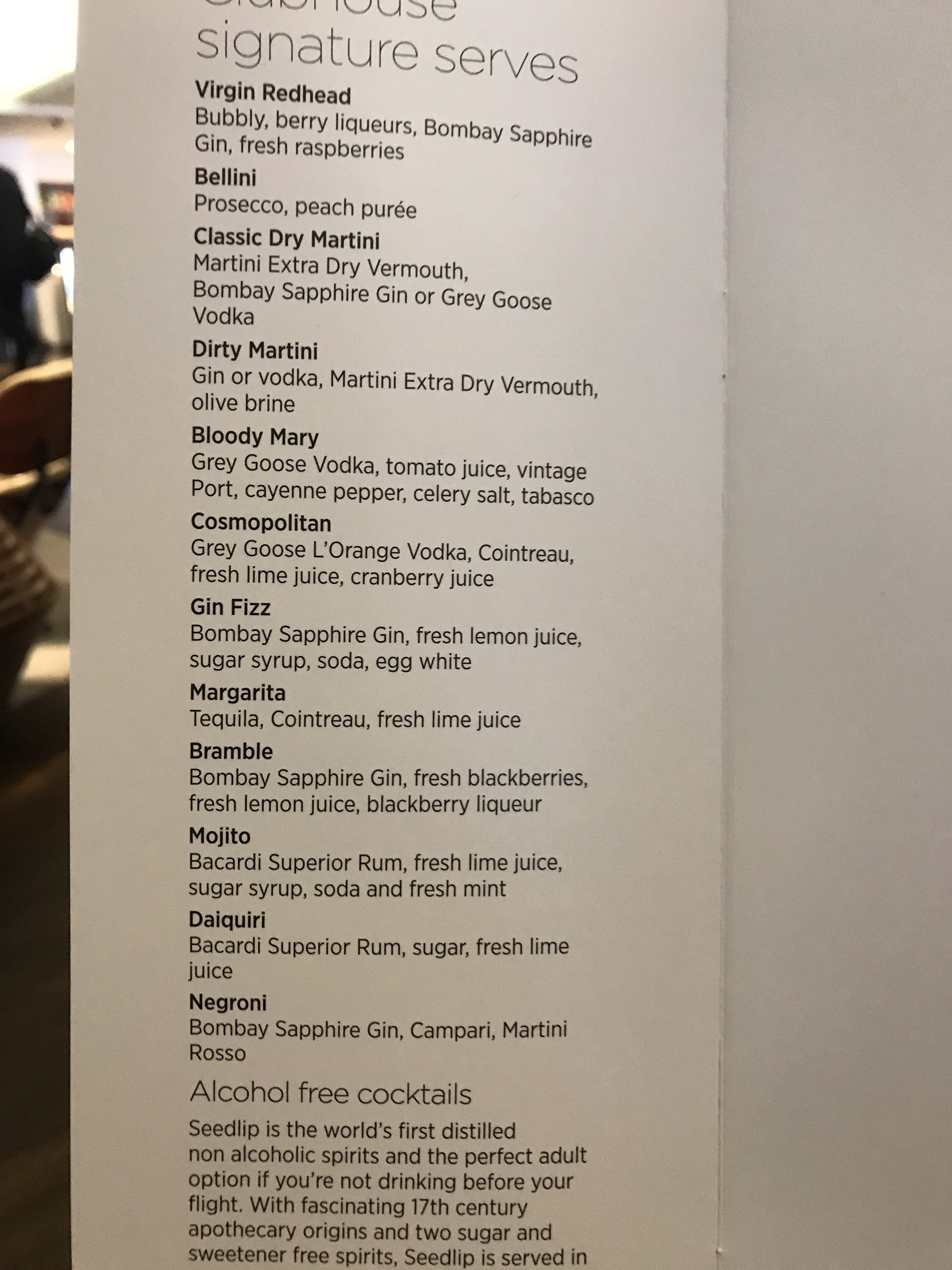 The drinks are all table service although if you don’t want to wait you can just order at the bar. One of the things I like most about the Virgin lounge is the drink selection. They may not have the fanciest wines or Champagne (I think BA often beat them in this area) but they have a fantastic range of top quality modern cocktails as well as all the classics. They currently have a special range of cocktails by top mixologists from Dandelyan at the Mondrian in London. Here is the list of cocktails: