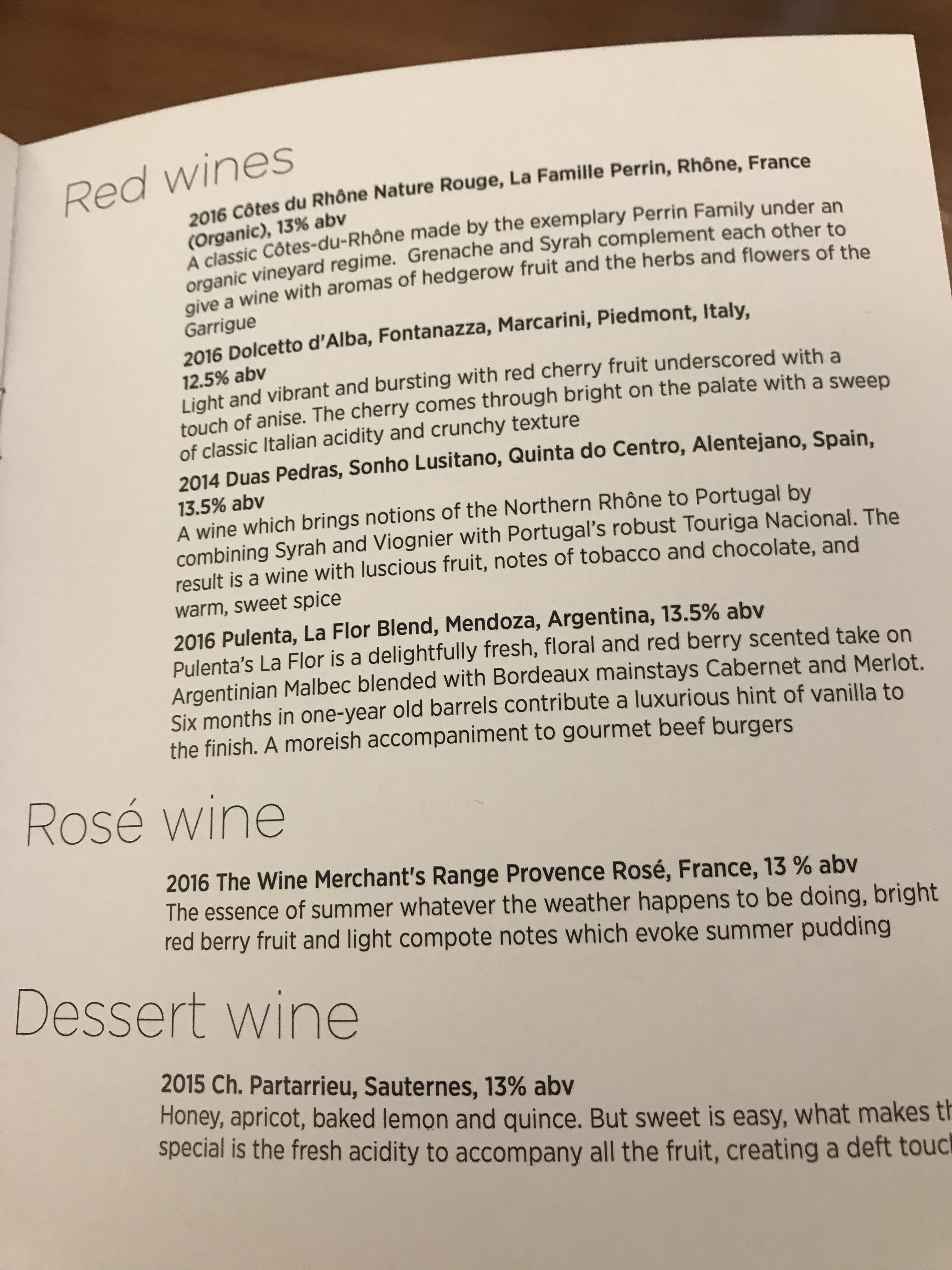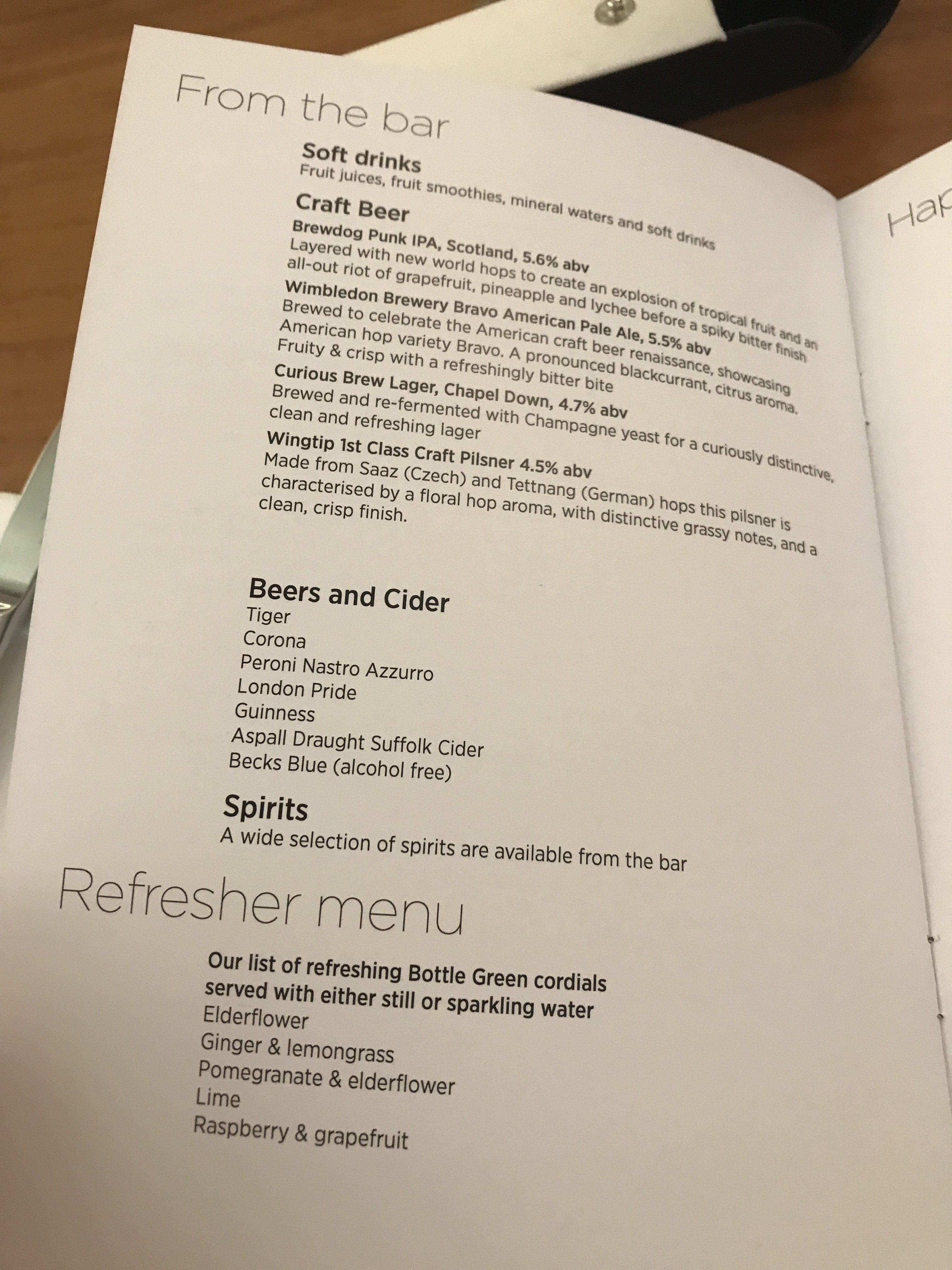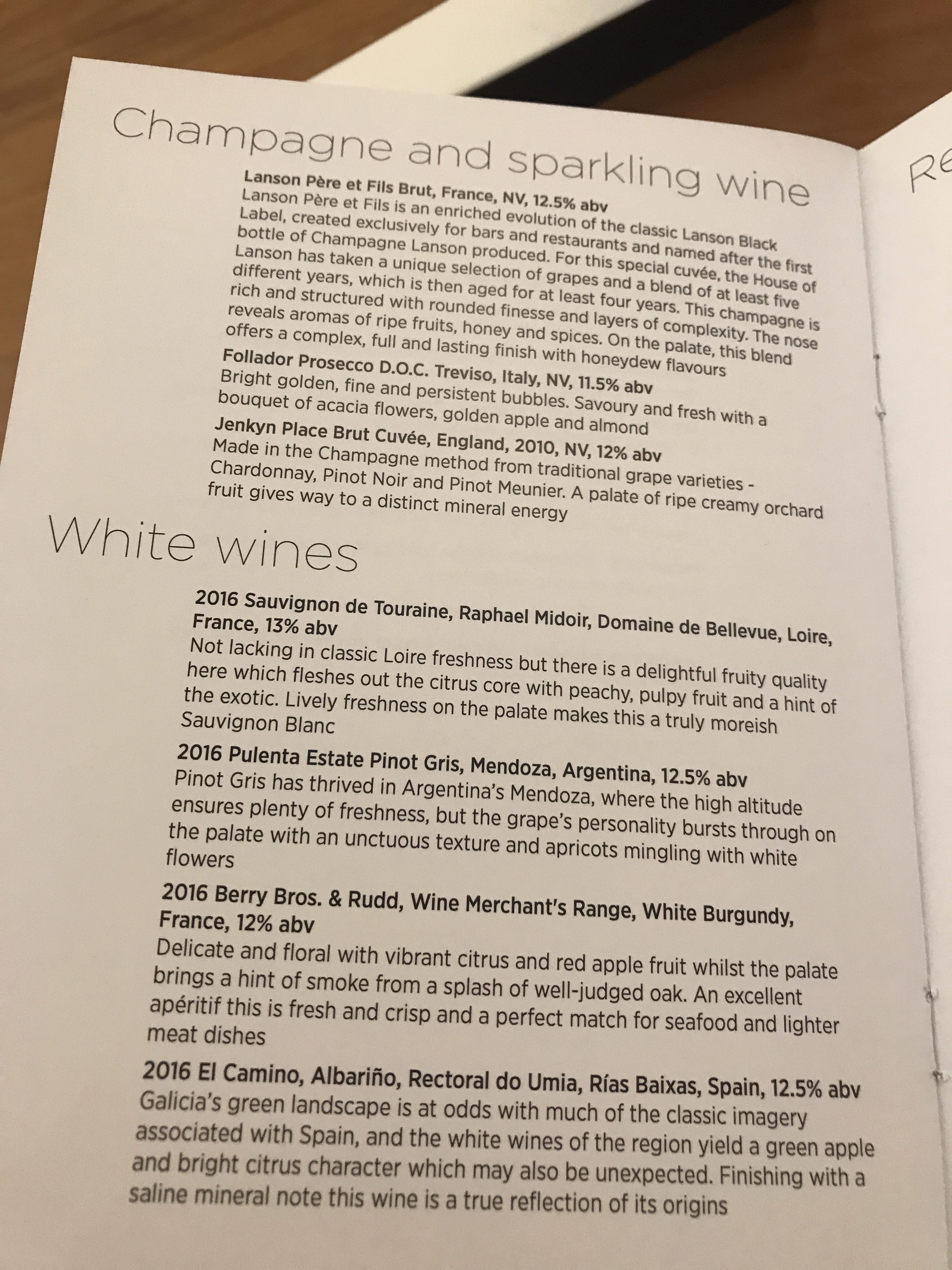 The wine selection may not be the finest vintages but I like the fact there is so much to choose from. As well as Champagne, English Sparkling wine, Prosecco, 4 red, 4 white and a rosé wine there was even a dessert wine – a Sauternes. The Champagne is the Lanson Pere et Fils Brut – one up from the standard Lanson Black label which I am not a fan of.