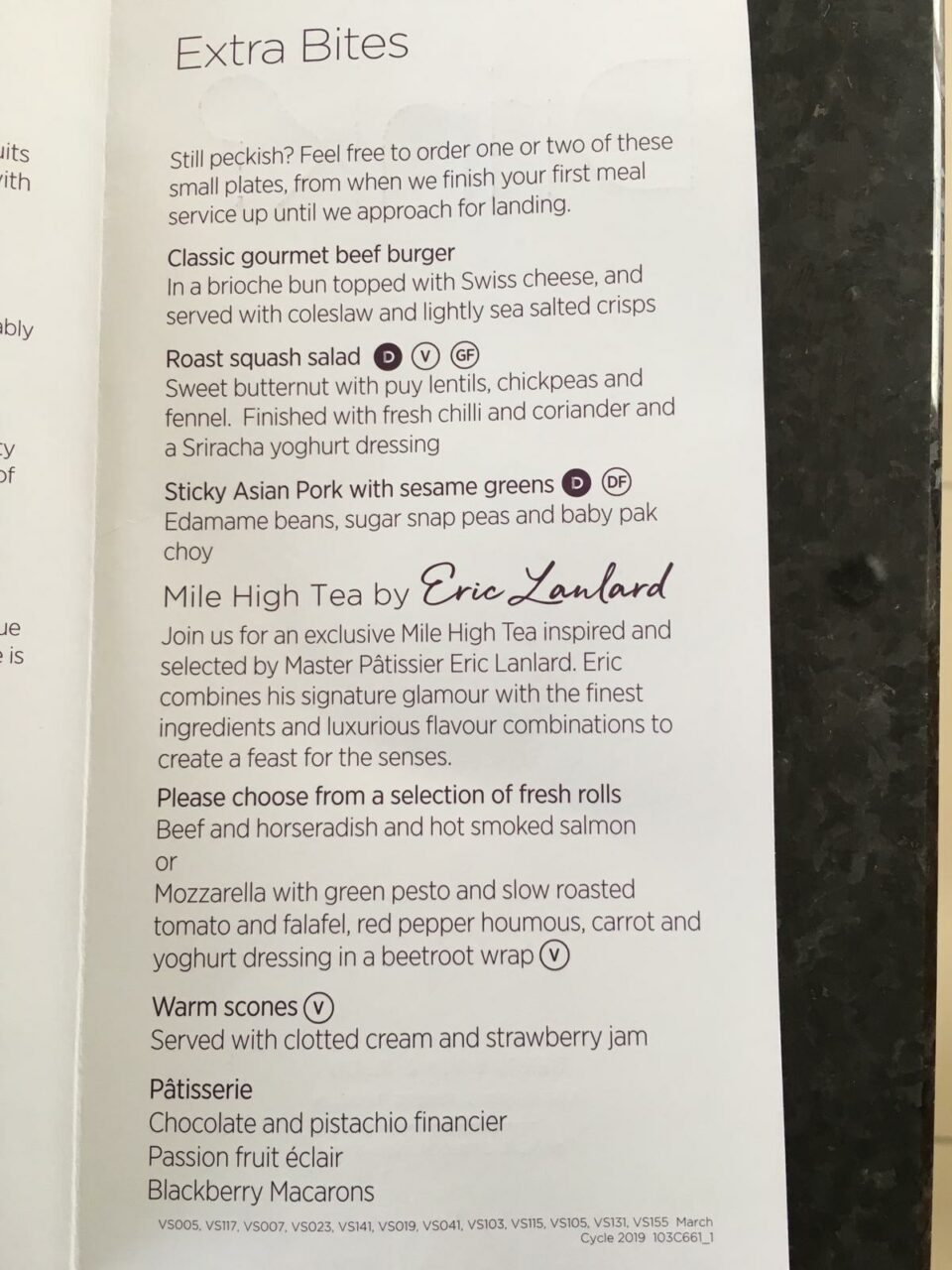 90 minutes before landing I ordered the much-lauded Mile High Afternoon Tea by Eric Lanlard. This was very disappointing. The dainty finger sandwiches I was expecting were actually massive chunky bread rolls and the pastries were ice cold. The scones were fine.