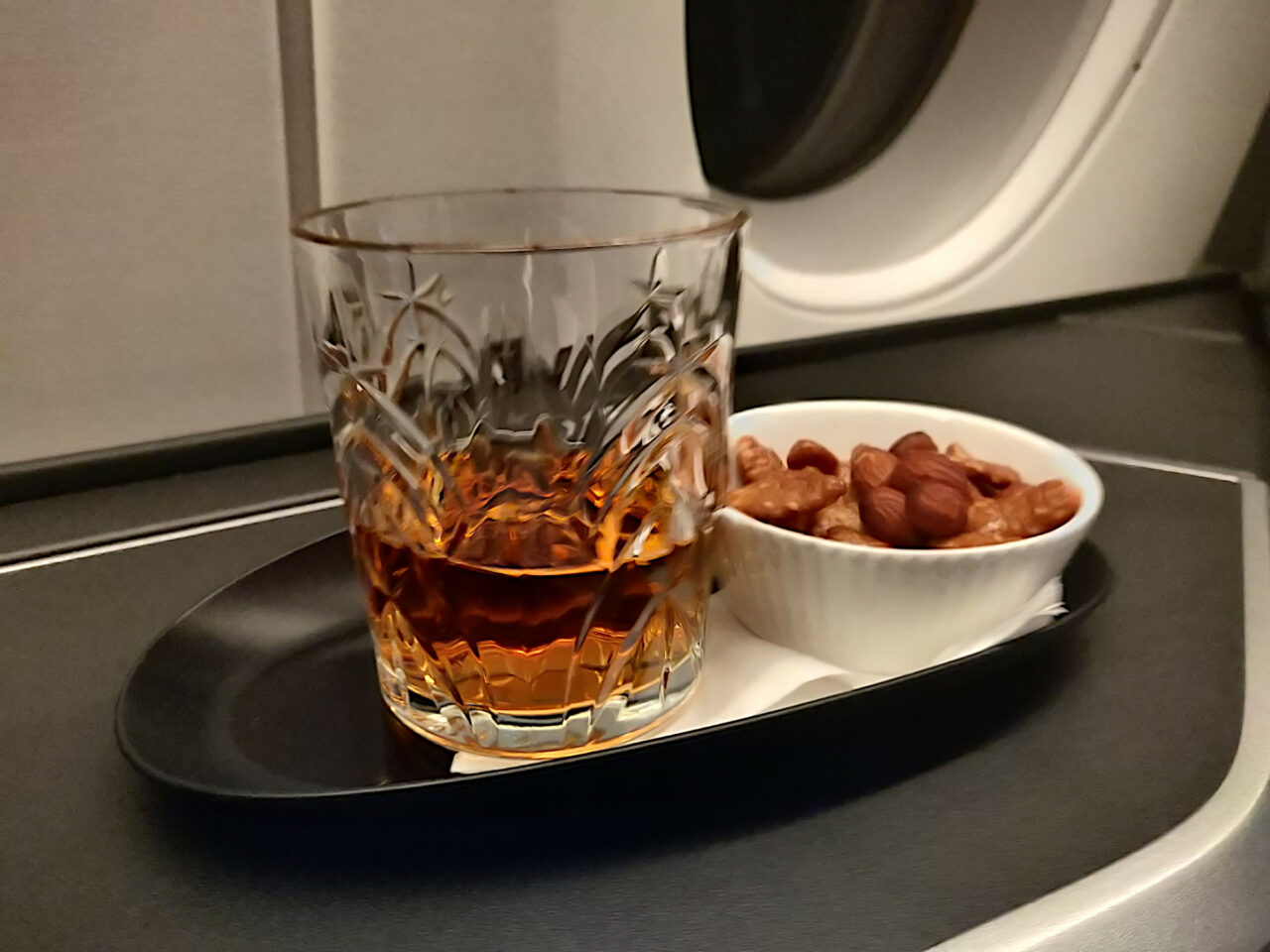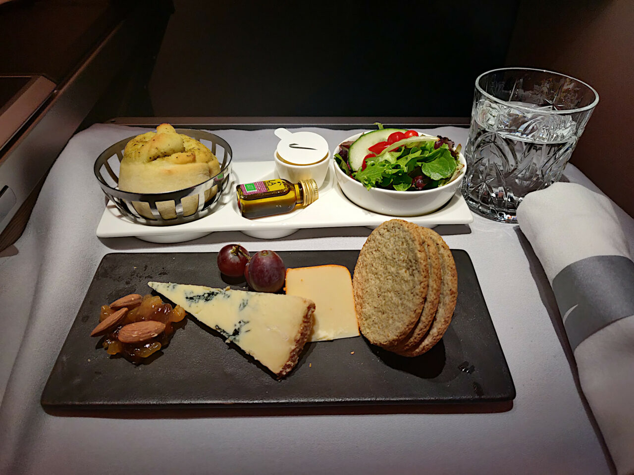 I’ve had dinner in the lounge, so I asked for just a cheese board with a glass of scotch right after takeoff. The crew obliged to my request and promptly delivered my drink as an aperitif and the cheese plate.