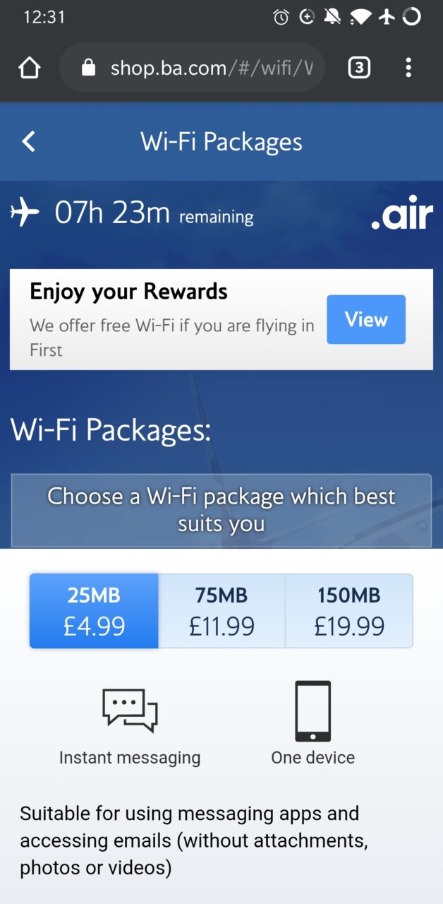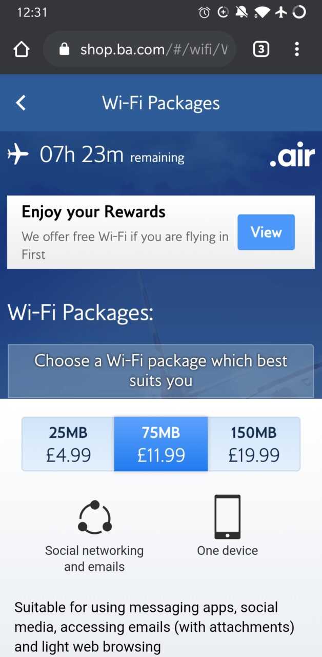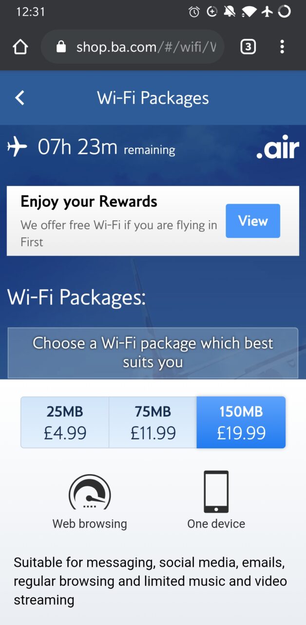 British Airways decided to keep the factory fitted internet option that means it’s slow, measured and expensive. 150MB costs £19.99 for the duration of the flight. I knew that in advance, so I prepared myself to be able to work offline, yet I got it for my phone to stay connected and it wasn’t enough – my phone ran out of data 3 hours into the flight. In my opinion, that’s a really poor show from BA – retrofitting a newer WiFi would have taken a couple of days at most and would allow BA to offer a consistent experience on all aircraft.