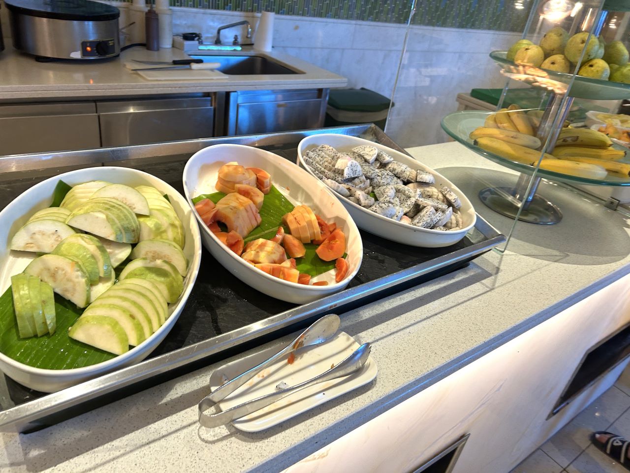 The buffet was incredibly comprehensive with high-quality food. There was everything from local Arabic dishes and Indian bread with curry to a beautiful selection of exotic fruit and juices. I particularly liked that you could order eggs to the table, including various styles of benedict, rather than having to wait around at an egg station. I went for the eggs royale, which were very good.