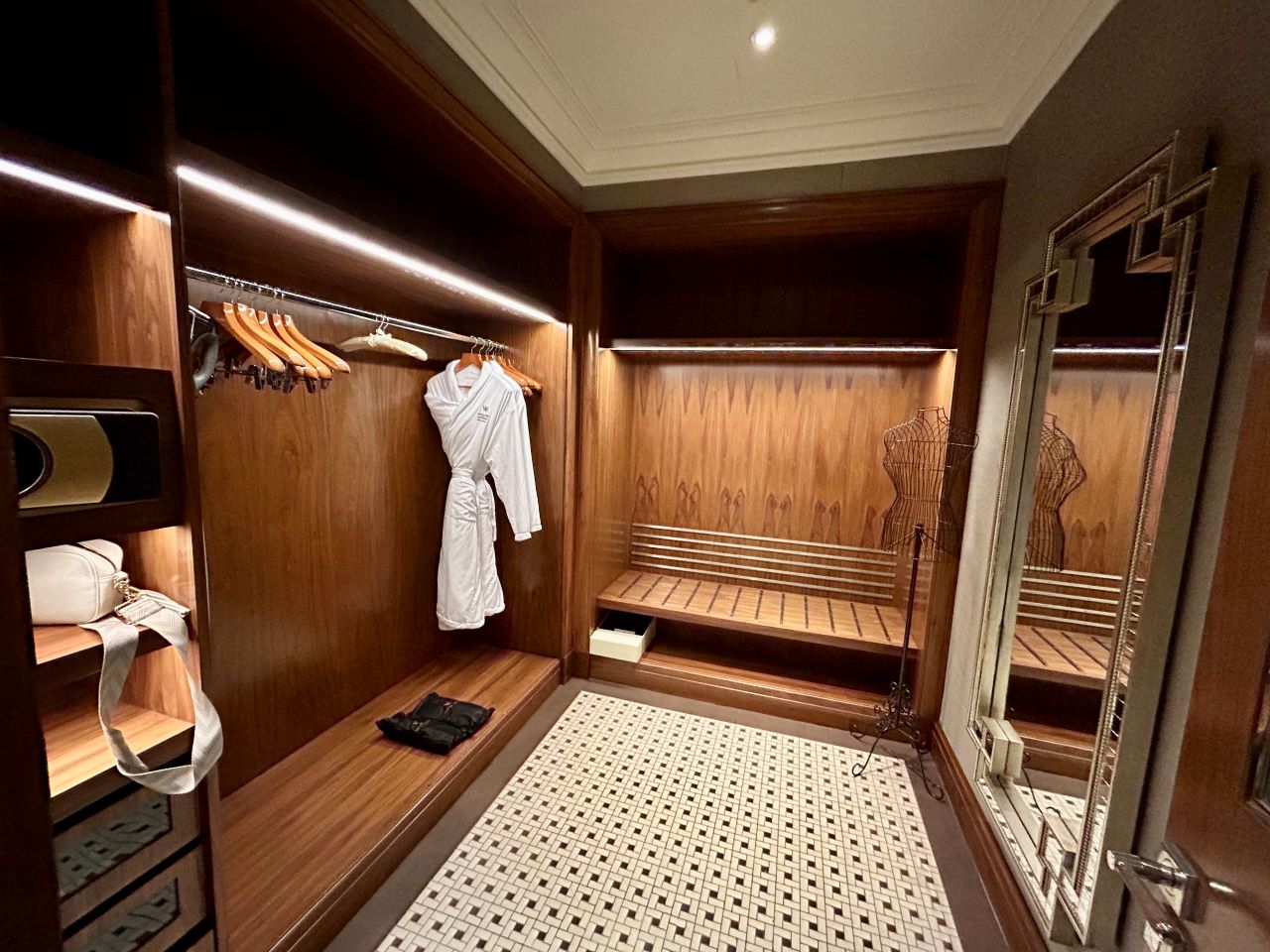 Then the hallway led to a very generous size walk-in wardrobe, that had plenty of room for a large suitcase to be left open, which I loved. This was also where the safe, iron and ironing board were. There was even a wire-framed mannequin for putting a dress on if you didn’t want to hang it up. I would normally expect a hotel at this level to provide some sort of bag or beach bag, but there were none here.
